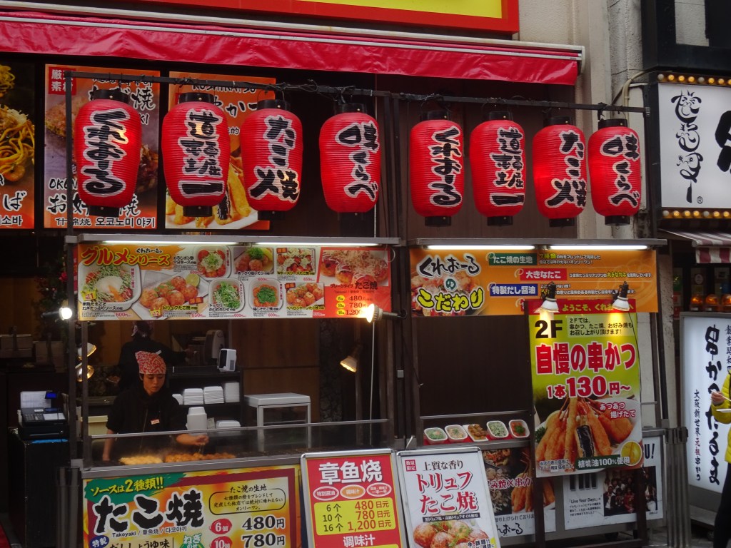 La prima cosa che cattura la mia attenzione è il grosso granchio luminoso che altro non è che l’insegna del ristorante Kani Doraku una vera istituzione per i locali ed anche i turisti che si fermano prevalentemente per fare un mucchio di foto. Lo street food in questo quartiere di Osaka è davvero il suo fiore all’occhiello soprattutto se siete amanti del pesce, servito in tutte le salse ed in tutti modi che al contrario di quello che noi occidentali possiamo pensare non si utilizza solo per preparare il sushi o il sashimi. Peccato che per chi come me è vegetariano trovare qualcosa di adatto da mangiare è veramente un’impresa non da poco considerato che anche molte zuppe vegetariane hanno come base brodo di pesce, per fortuna mia però esiste il miso, le alghe e il matcha, oltre alla possibilità di trovare anche qualche involtino di riso con solo ripieno di verdura.